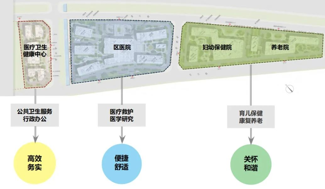 中地塊:便捷舒適,規(guī)劃建設(shè)以區(qū)醫(yī)院為主,功能包括門(mén)診、醫(yī)技、住院及其他醫(yī)療服務(wù)功能;