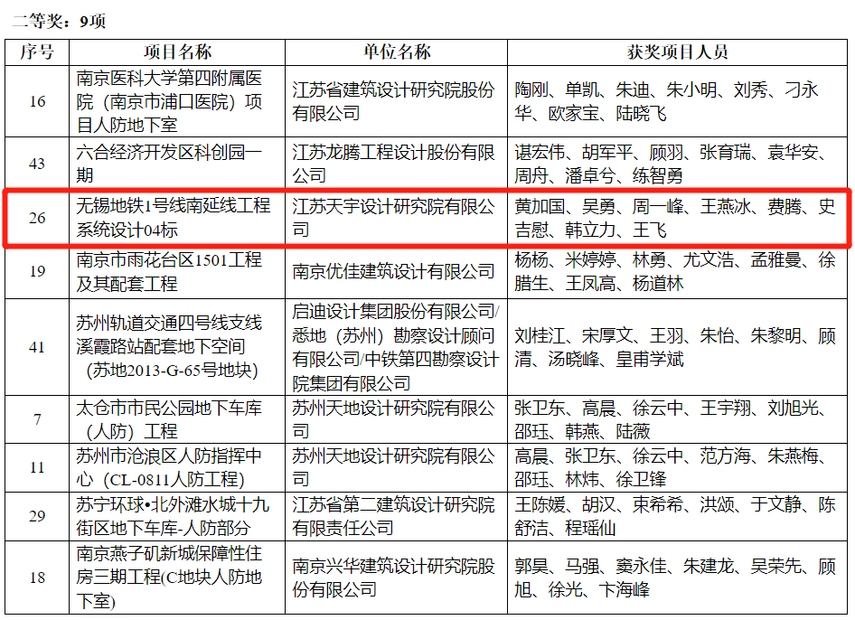 近日,2022年度江蘇省優(yōu)秀工程勘察設(shè)計(jì)行業(yè)獎(jiǎng)(部分類別)評(píng)審結(jié)果正式公布,江蘇天宇設(shè)計(jì)院積極參加本次評(píng)優(yōu)活動(dòng),并榮獲人防工程設(shè)計(jì)2個(gè)獎(jiǎng)項(xiàng)。其中,二等獎(jiǎng)1項(xiàng)、三等獎(jiǎng)1項(xiàng)。