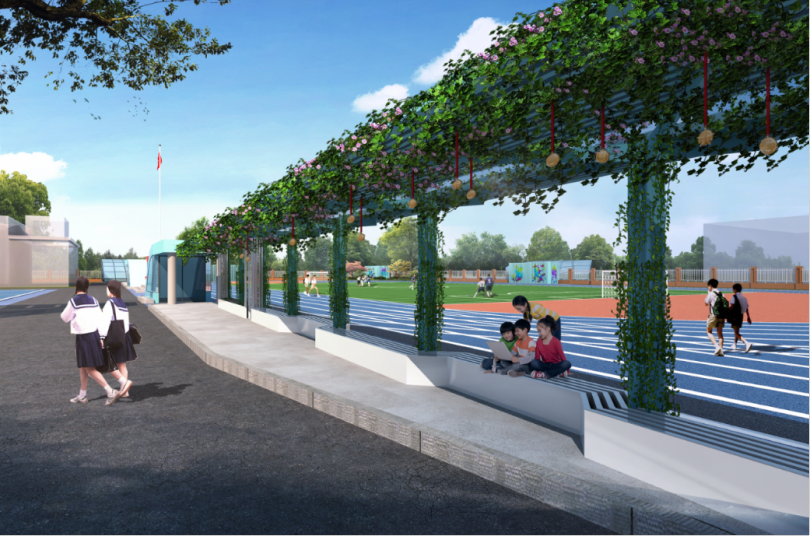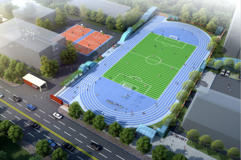跑道升級改造:地面上,學校操場進行升級改造,對操場跑道進行形象升級,操場西側(cè)與教學區(qū)相接部位布置司令臺、國旗臺、廊架及景觀小品設(shè)施。