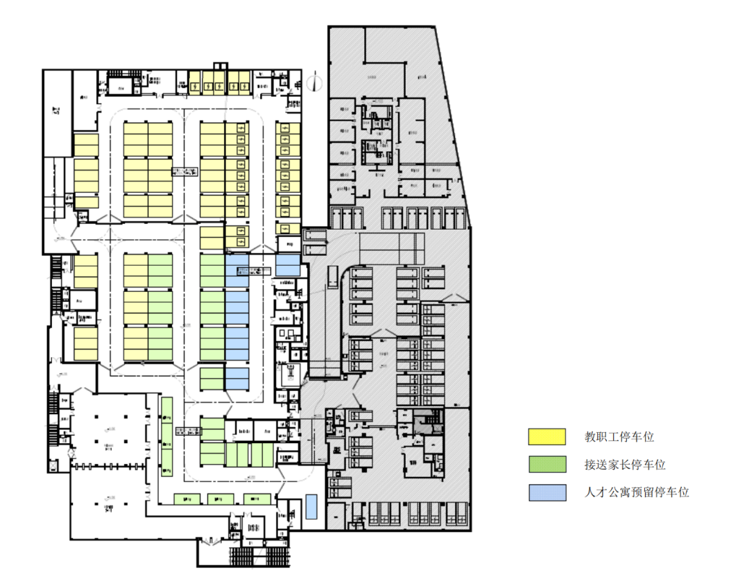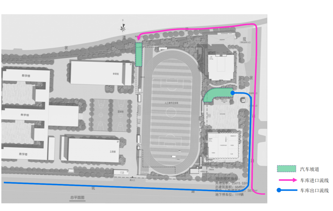 出入口流線型設(shè)計:方案結(jié)合實際使用與功能,在用地西北側(cè)設(shè)置一個4.5米寬的單車汽車坡道,并利用東側(cè)地塊的人才公寓地下室共用一個7米的雙向汽車坡道,以此形成一個一進一出順暢的環(huán)通流線,有效改善了上下學時段路面主干道的擁堵情況。