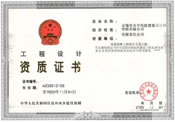 近日,無錫市天宇民防建筑設(shè)計(jì)研究院有限公司順利獲得江蘇省住房與城鄉(xiāng)建設(shè)廳頒發(fā)的風(fēng)景園林工程設(shè)計(jì)專項(xiàng)乙級資質(zhì)證書,為今后我院開辟新領(lǐng)域、培育新經(jīng)濟(jì)增長點(diǎn)提供了良好的資質(zhì)保障。