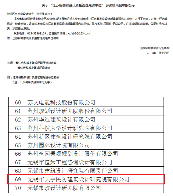 近日,江蘇省勘察設計行業(yè)協(xié)會公布“江蘇省勘察設計質(zhì)量管理先進單位”評選結果名單,無錫市天宇民防建筑設計研究院有限公司榜上有名。